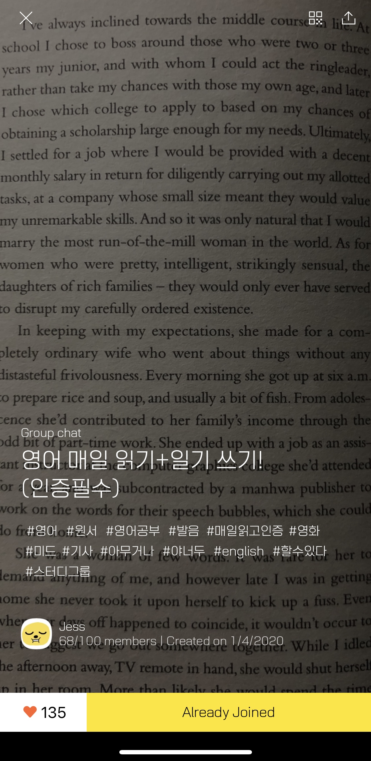 이 포스팅을 우연히 발견하신 새로운 분들도 입장하셔서 눈팅을 하다가 꾸준히 낭독, 영작하는 습관을 같이 들여보시면 하는 마음에 아래 스터디방 링크도 공유해본다.