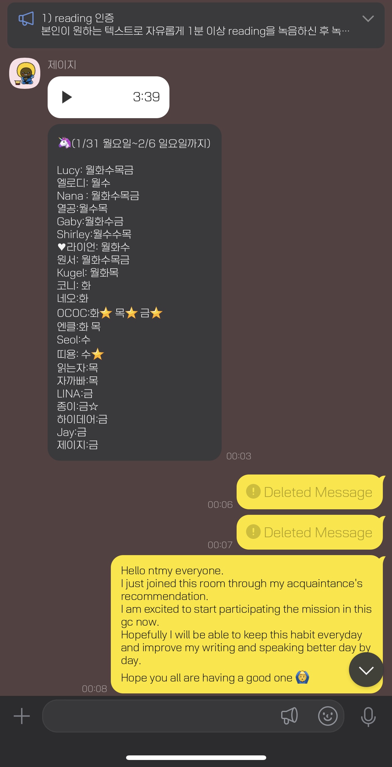 앞 사람이 인증한 표를 복사해 닉네임과 녹음을 올린 요일을 기입하면 인증 완료입니다.