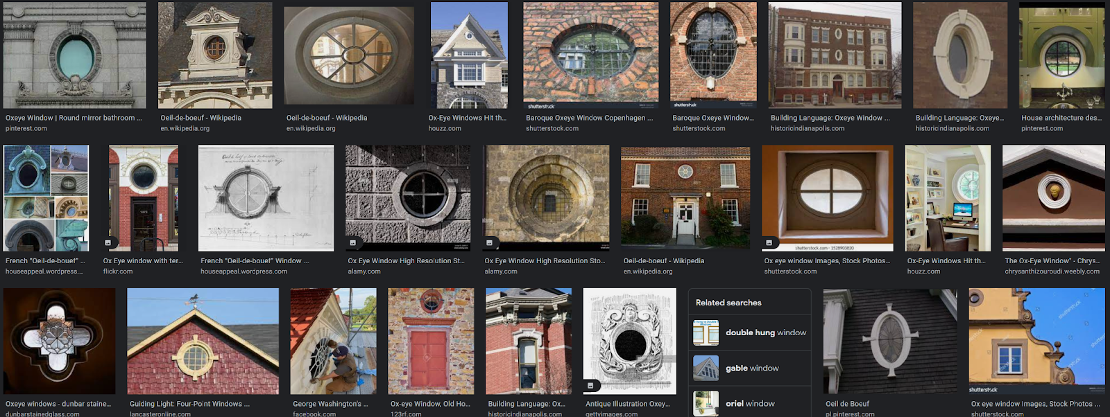 Where would you most likely find a kite winder, an enfilade, and an oxeye?