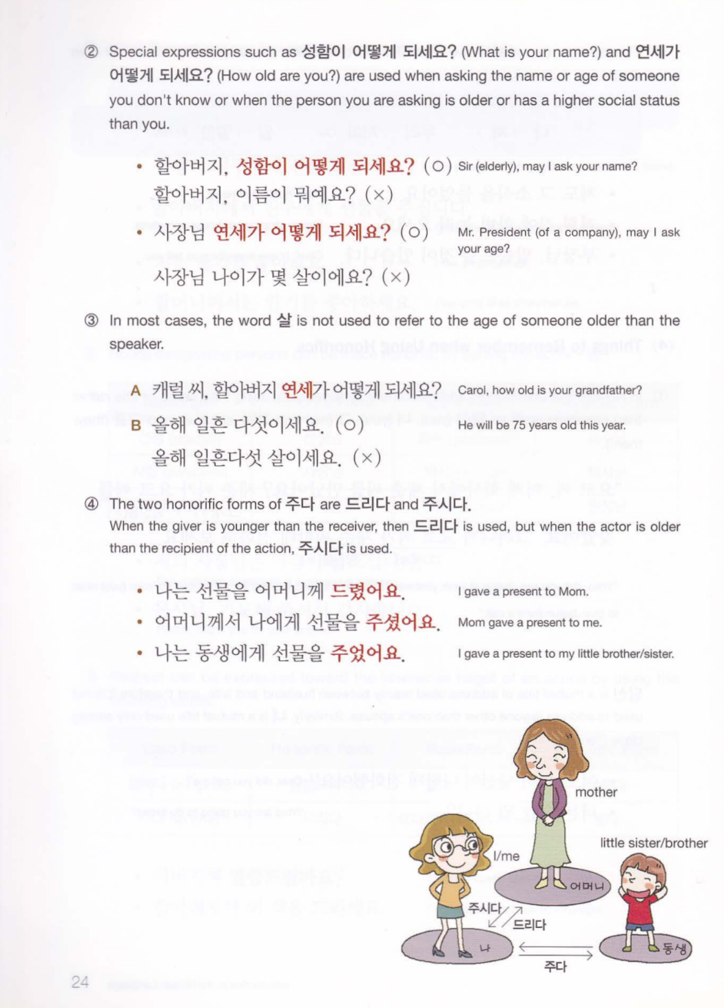 2. Special expressions such as 성함이 어떻게 되세요? (What is your name?) and 연세가 어떻게 되세요? (How old are you?) are used when asking the name or age of someone you don't know or when the person you are asking is older or has a higher social status than you.