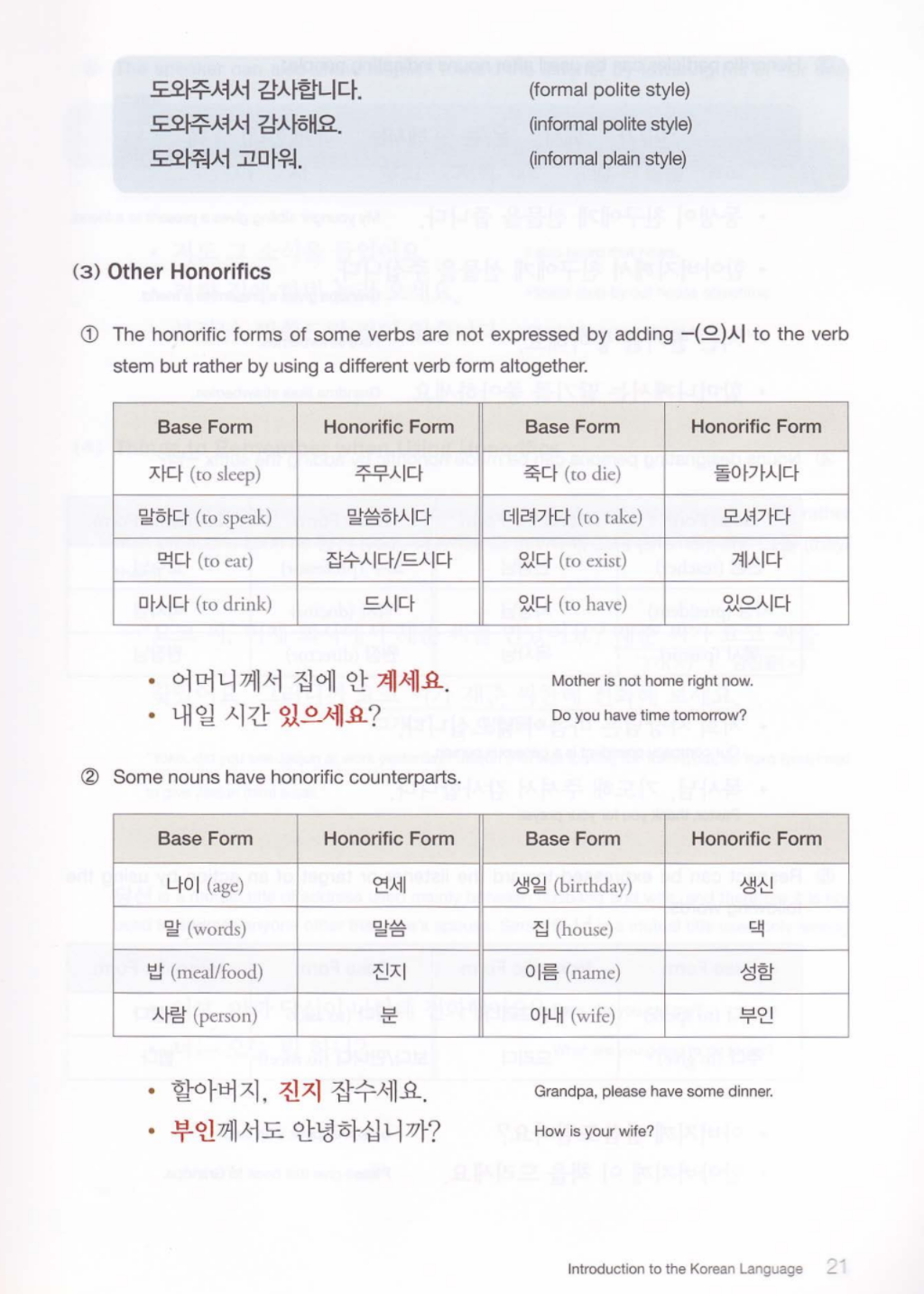 1. The honorific forms of some verbs are not expressed by adding -(으)시 to the verb stem but rather by using a different verb form altogether.
