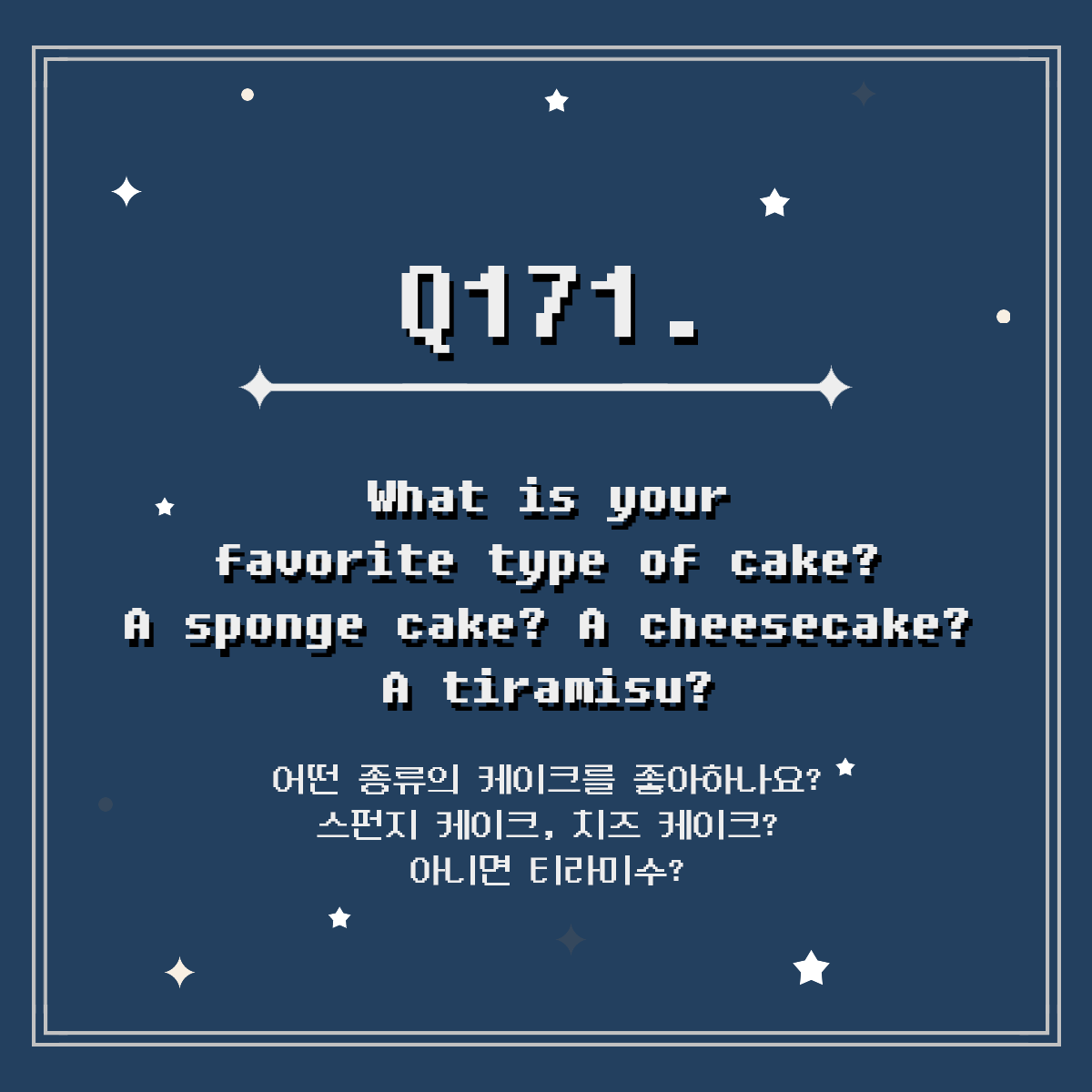 Q171. What is your favorite type of cake? A sponge cake? A cheesecake? A tiramisu?