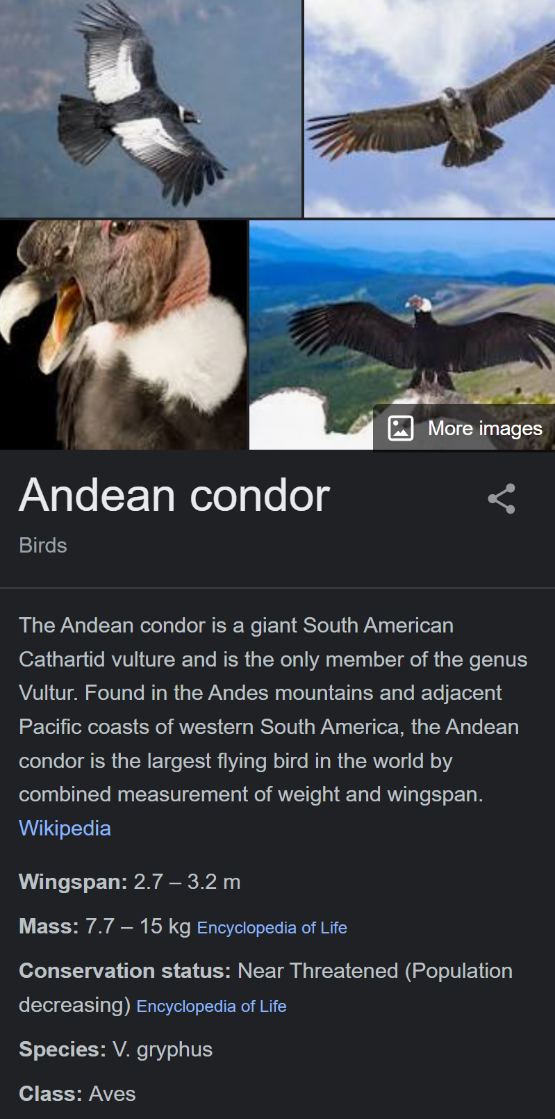약 3.2m 길이의 날개폭을 가진 Andan condor가 퀴즈 선택지에서뿐만 아니라 세상에서 가장 큰 날개폭을 가진 새다.