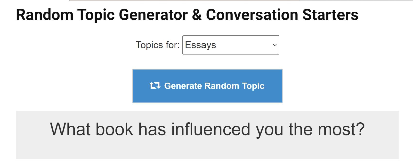 Looking for a new conversation topic or a new writing prompt? Try our free random topic generator.